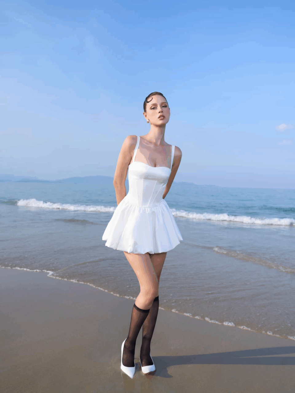 This adorable pink apron mini dress set, style “Candy Pop” DR512, features a vibrant hot pink pinafore-style dress layered over a soft baby pink fitted t-shirt. The dress is designed with a playful front pocket, flirty pleated ruffle hem, and frayed detailing for extra charm. Perfect for achieving that cute, youthful, doll-like vibe, this set is styled with sheer white tights for a dreamy, playful seaside look. The combination delivers a sweet and fun aesthetic that’s perfect for making a statement on any sunny day out.